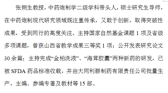 中药学学科现有博士生导师6名,他们在中药学学科各领域如中药药性研究、中药复方化学、中药制剂新技术、中药神经药理等,拥有领先成果,受到国内外广泛关注。学术队伍中有省学科带头人1名,国务院特贴专家2人,省卫生系统有突出贡献专家2名,山西省委联系的高级专家3名,国家自然科学基金会评专家5名,导师队伍培养实力强,研究方向特色明显。
