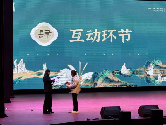 在现场互动环节,主持人围绕经典书籍的问题,引发台下同学热烈响应。大家踊跃举手,积极上台回答问题,并领取小奖品。此次互动为活动增添了欢乐氛围,让书香在轻松愉悦的氛围中浸润校园。
