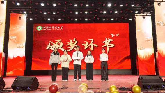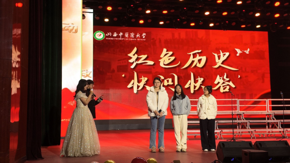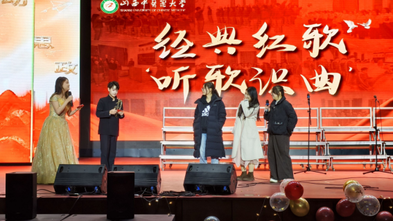 为让现场氛围持续升温,比赛中场设置“听歌识曲”和“快问快答”互动环节。主持人提出关于历史与红歌的问题,播放红歌片段,台下同学积极举手、争相作答,回答正确的同学获得精美礼品。