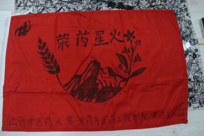 团队风采展示环节,我们用一场融合红色基因与专业特色的表演,诠释这份"协同之力"。《强军战歌》的激昂旋律响起时,我们列队上场,歌声里藏着对前辈的致敬,也透着青年的锐气。最让大家驻足的是我们的班旗——黑白勾勒的山峦是井冈山的剪影,沉甸甸的麦穗象征工农群众的坚实根基,旁边几株草药尤其醒目:"这藏着军民鱼水情的温暖;当年红军用草药救治伤员,如今我们要让中医药在新时代发光发热,就如我们口号中“草木承红韵,药香续井冈——用道地药材,讲百年风云!”。