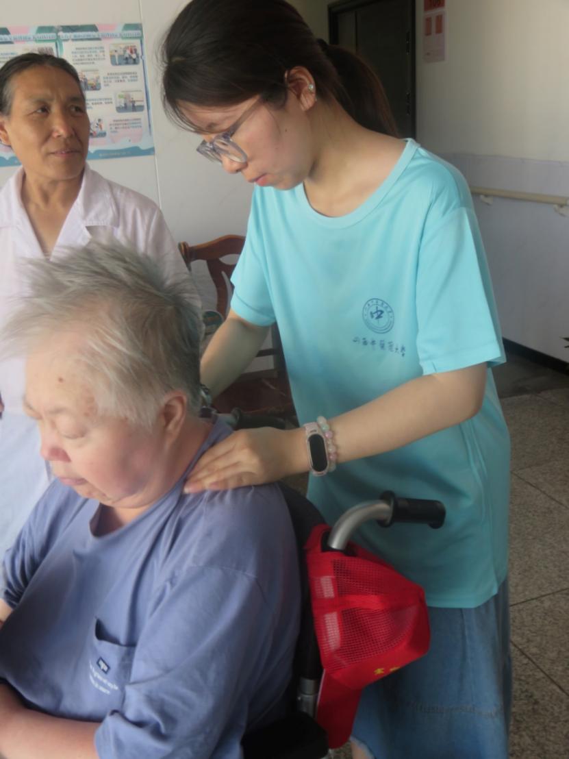 7 月 6 日,实践队聚焦专业实践转化,将课堂所学理论知识应用于实际:向养老院护工系统传授适用于老年人的穴位按摩技巧,把中医药养生保健知识送到基层养老服务一线。通过此次实践,队员们深刻领悟 “纸上得来终觉浅,绝知此事要躬行” 的道理,专业应用能力得到切实提升,也为基层养老服务注入了中医药智慧。
