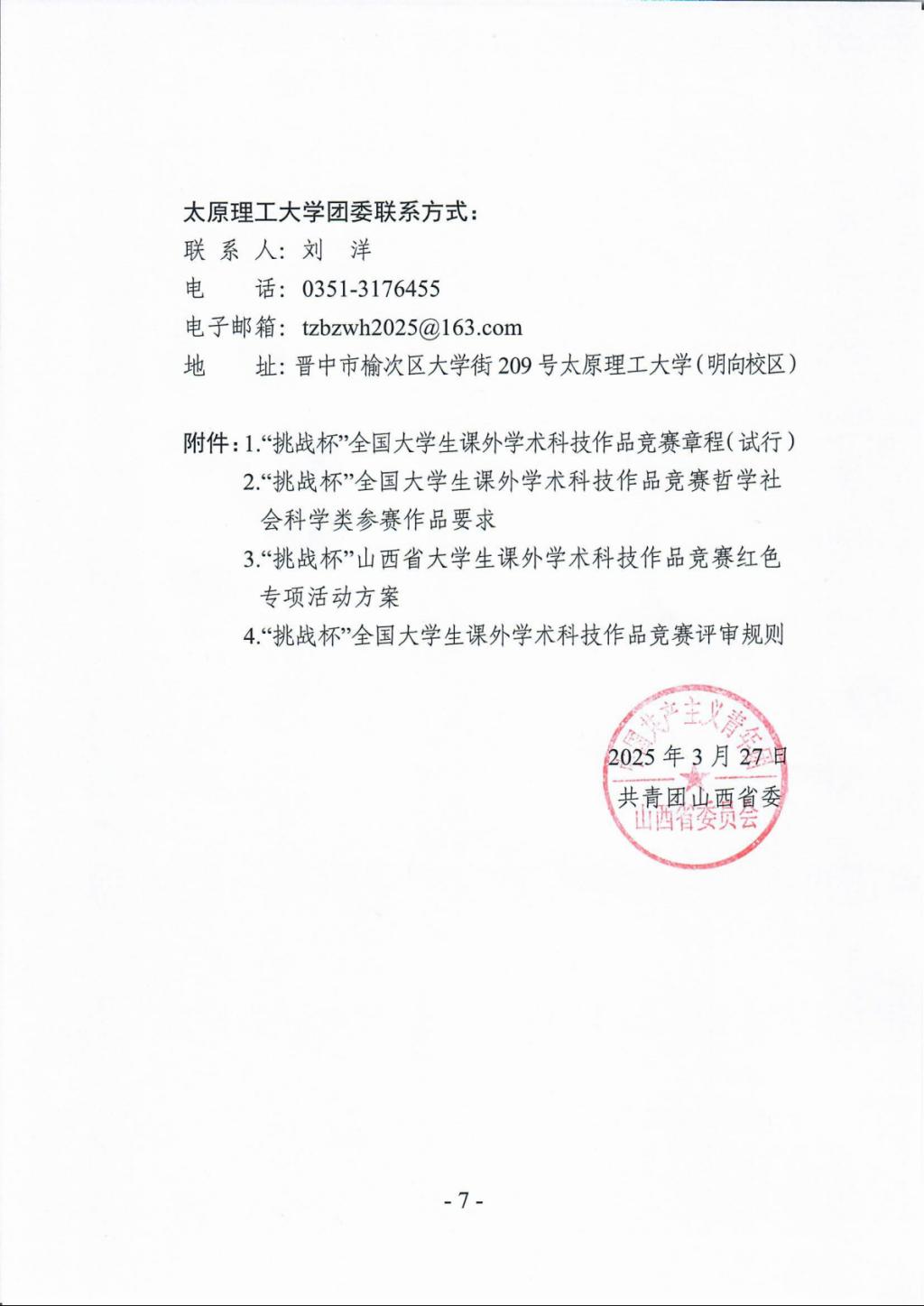 为深入贯彻党的二十大和二十届二中、三中全会精神,引领广大青少年深刻感悟在以习近平同志为核心的党中央坚强领导下,新时代党和国家事业取得的历史性成就和发生的历史性变革,持续激发爱党爱国爱社会主义的热情,厚植家国情怀,涵养进取品格,紧跟党投身全面建设社会主义现代化国家、全面推进中华民族伟大复兴的新征程,以奋斗姿态书写绚丽青春篇章,第十九届“挑战杯”山西省大学生课外学术科技作品竞赛组委会决定举办红色专项活动。相关事宜通知如下。